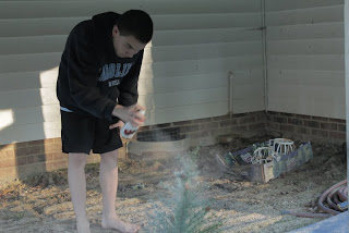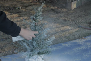 I wanted to spray paint the tree white but it was too cold outside. WELL, we’ve had a warm stretch here in NC so Son #4 ran outside and put a couple of coats of white spray paint on this baby.