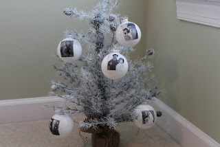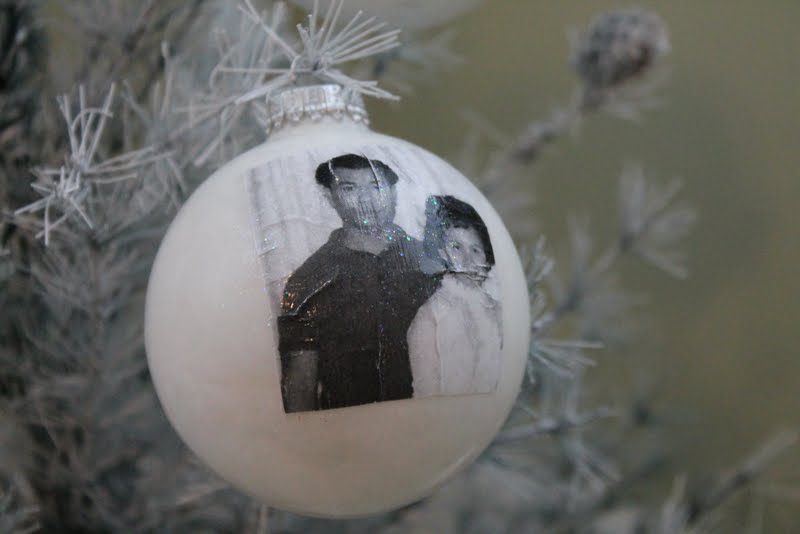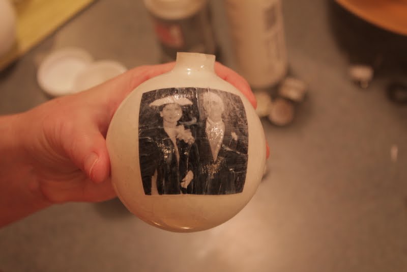 I wanted to glue a small black and white picture of my family (grandparents, parents and us) inside each ball. Then coat the inside of the ornament with the Mod Podge glitter paint. Well, what do they say about best laid plans?