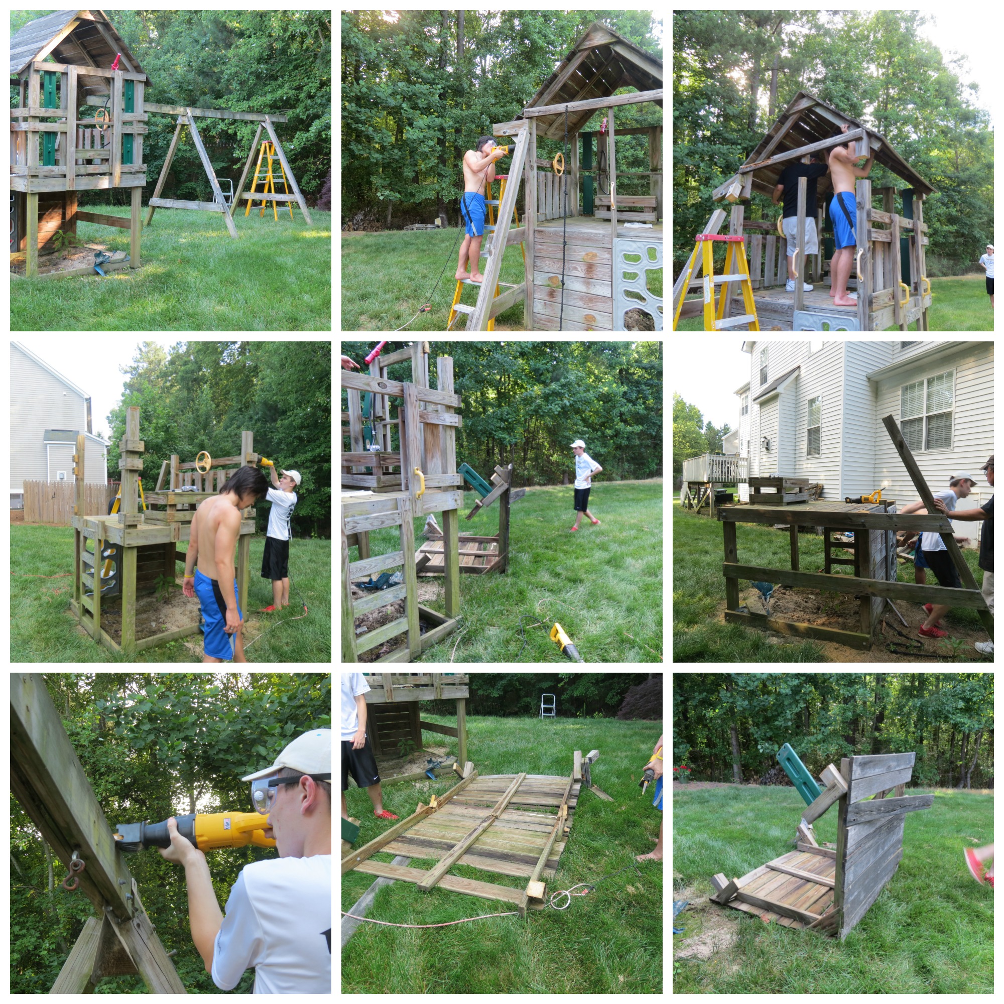 Our present swing set was weathered and deteriorating. The swings were breaking away from the chains, the bench swing was in such bad shape, the wood on the seat was painful to sit on. The slide had broken in half a few years ago so we had to remove it and board up the opening.