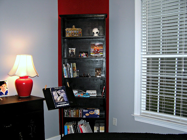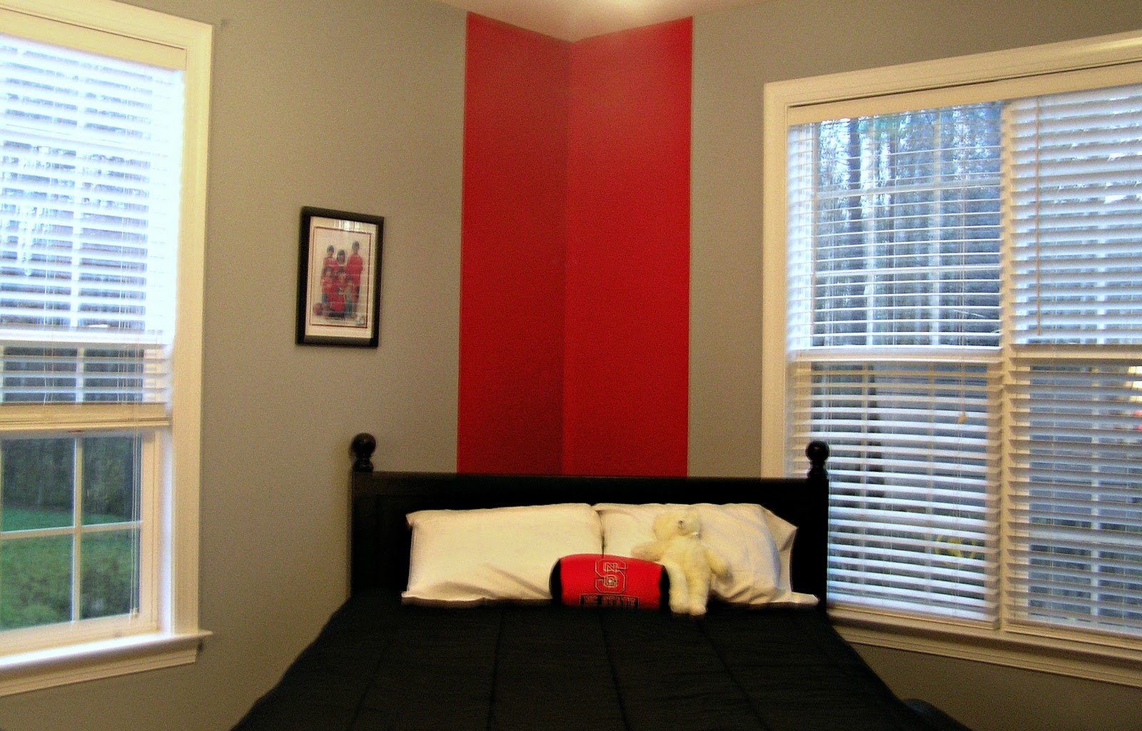 The next year, after much begging, Son #1 got his own room. When he was away at Winter Retreat with our church youth group, we surprised him by converting the guest room into an NC State University room just for him. The school’s colors are black and red.