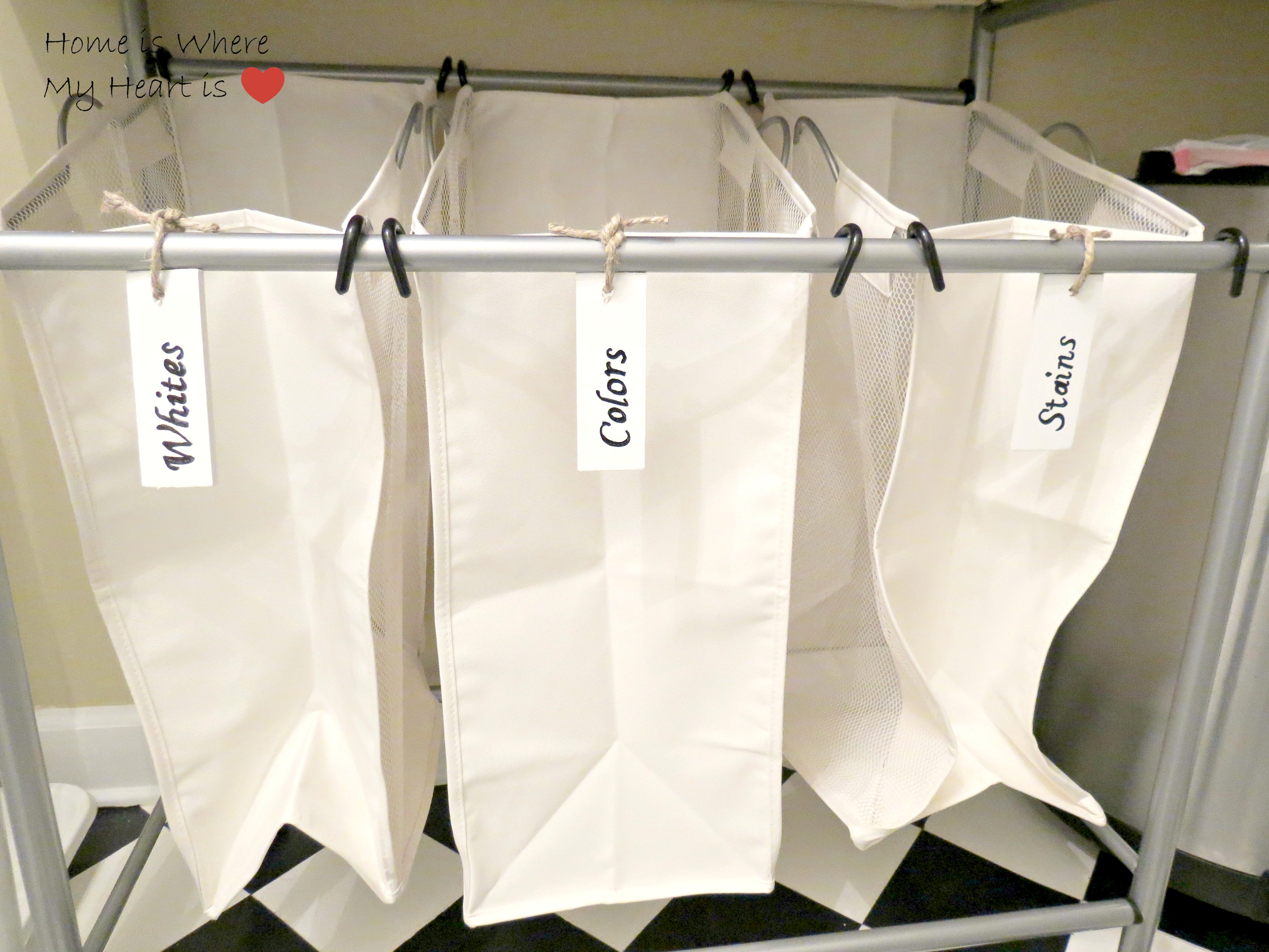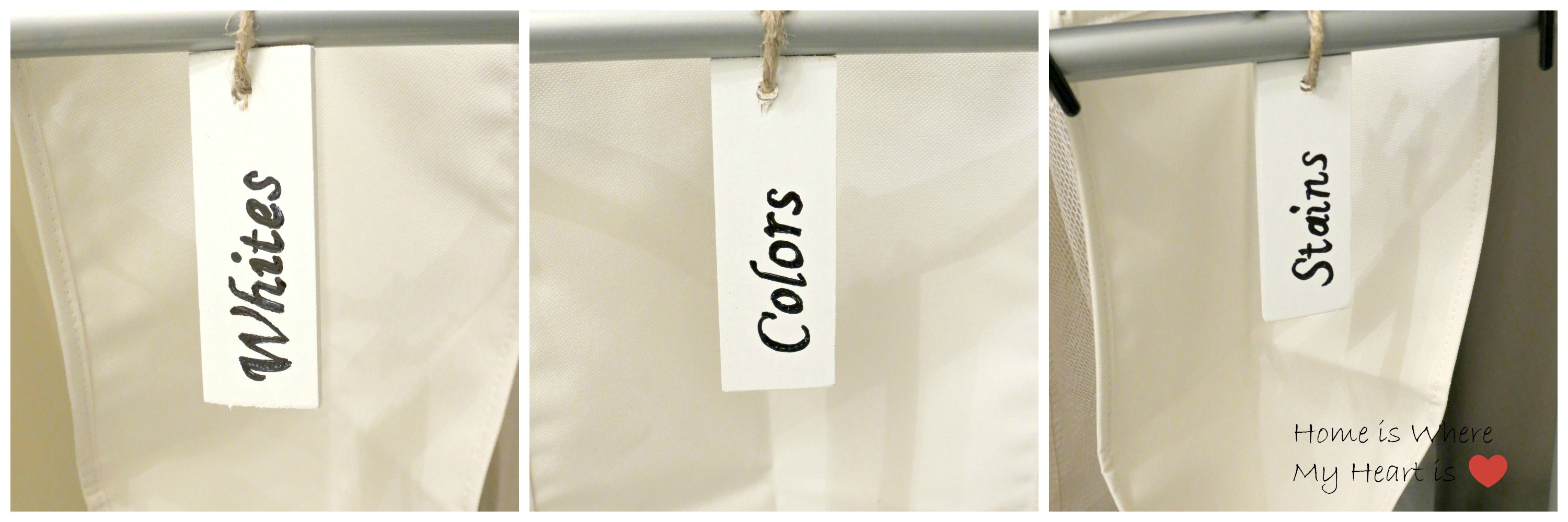 I also made wooden labels for the new three bag hamper. The LOML cut three 2×4 pieces of wood and drilled a small hole at the end for the string. I spray painted them white, printed out each word in the size and font I wanted. Then I traced the word with a pencil onto the wood. I then used a paint pen to write the words. It came out better than I had hoped.