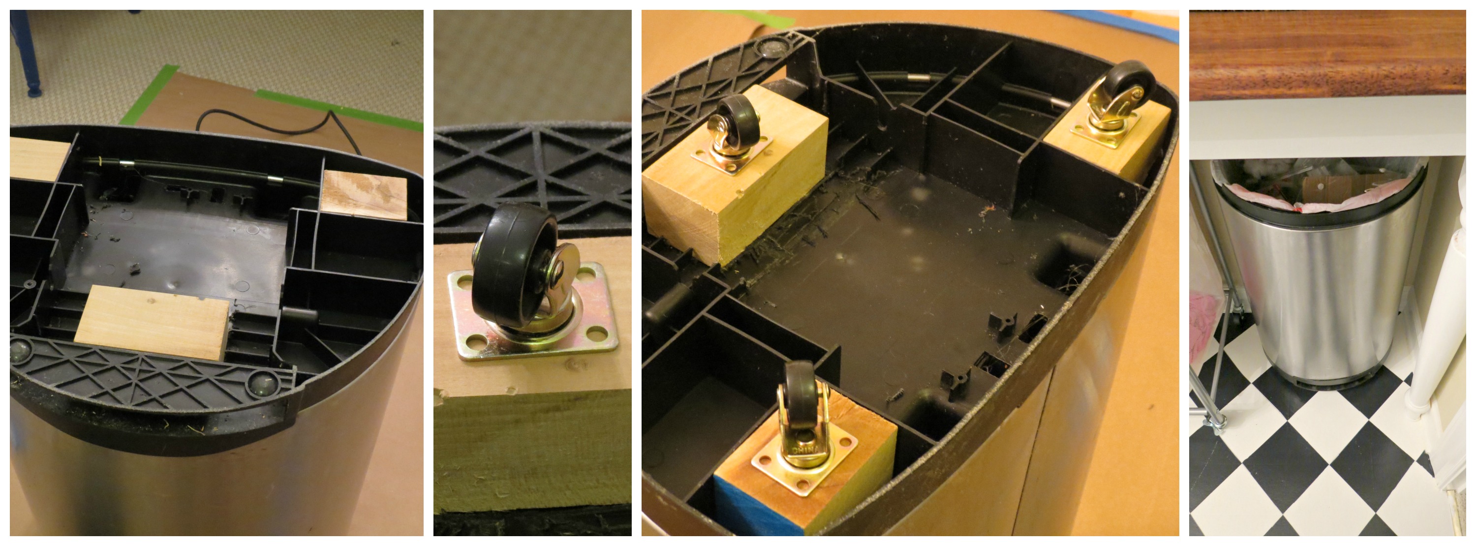 After the last laundry room post, we finished putting casters on the bottom of the existing garbage can that will go under the two-legged table. Have I told y’all lately what a genius the LOML is? He figured out a way to make exactly what I pictured in my head.