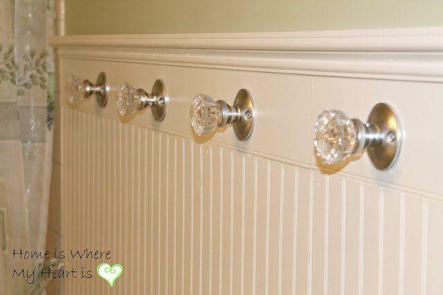 We added a little bling bling to the beadboard paneling for hanging wet towels.