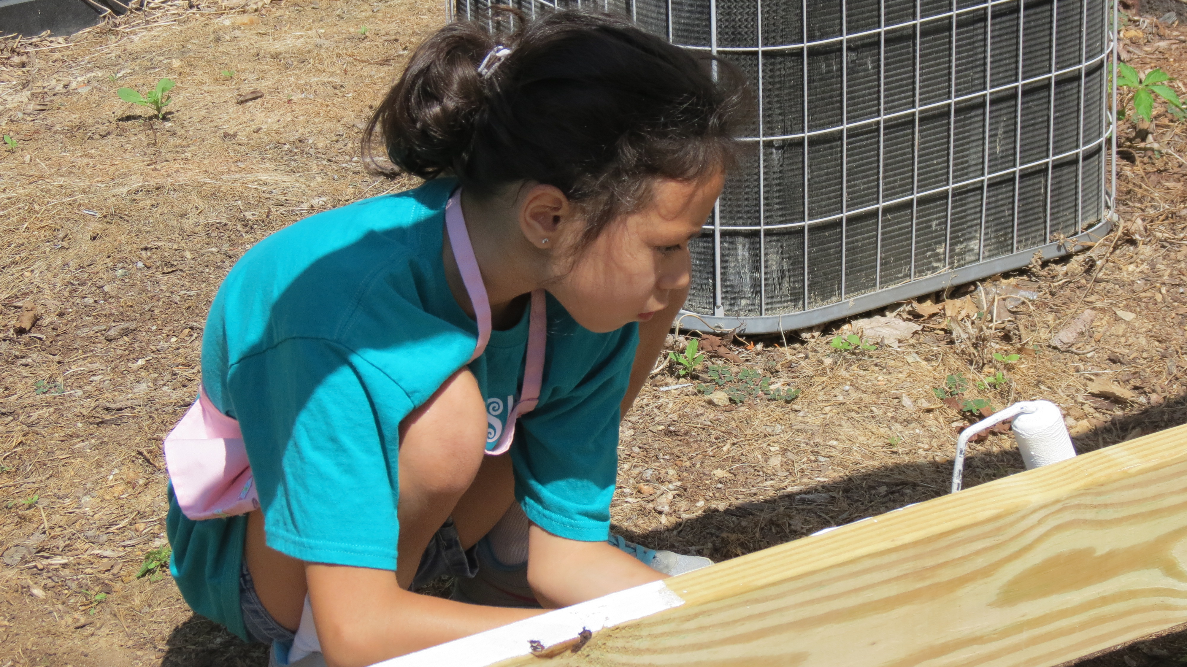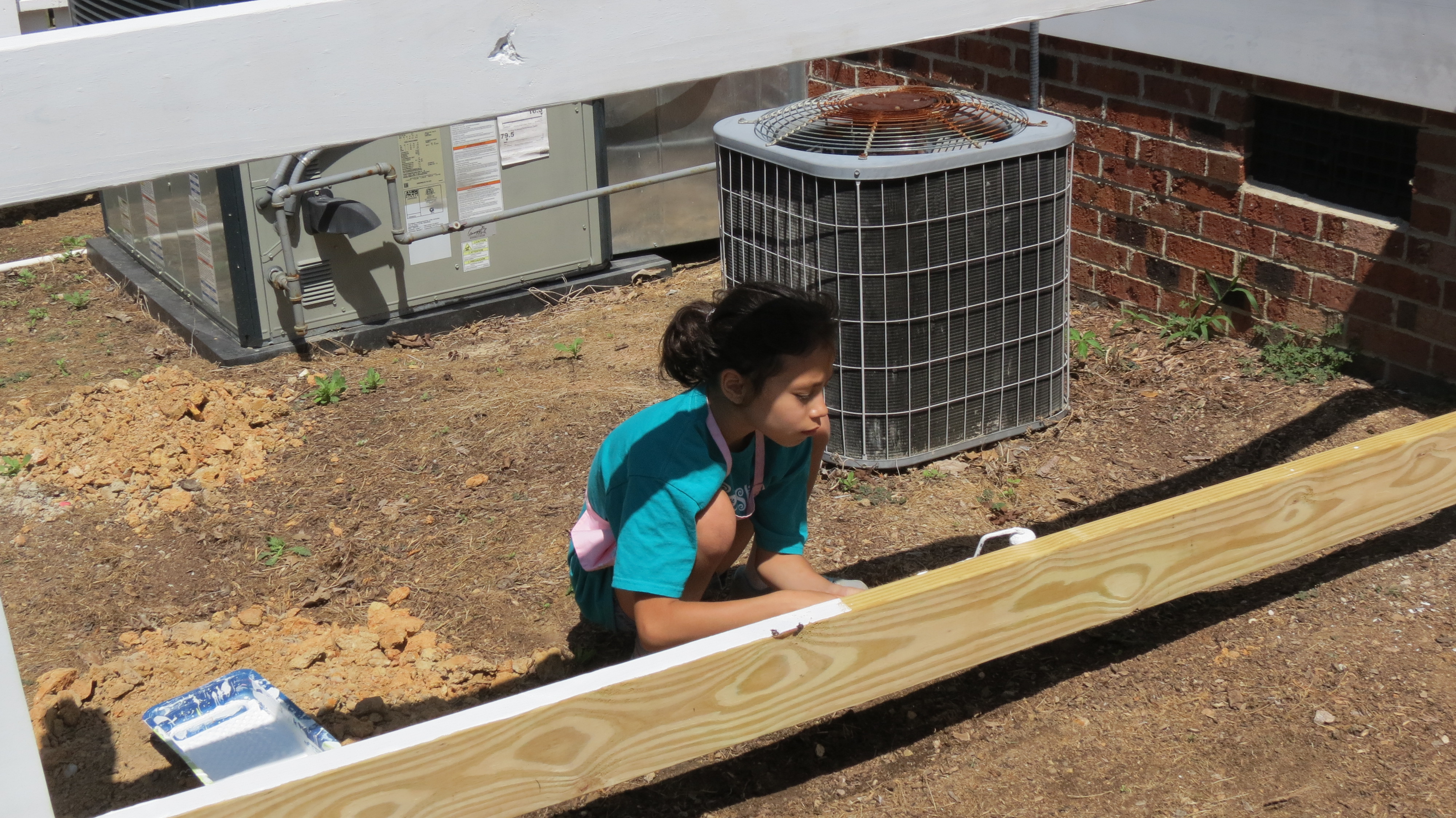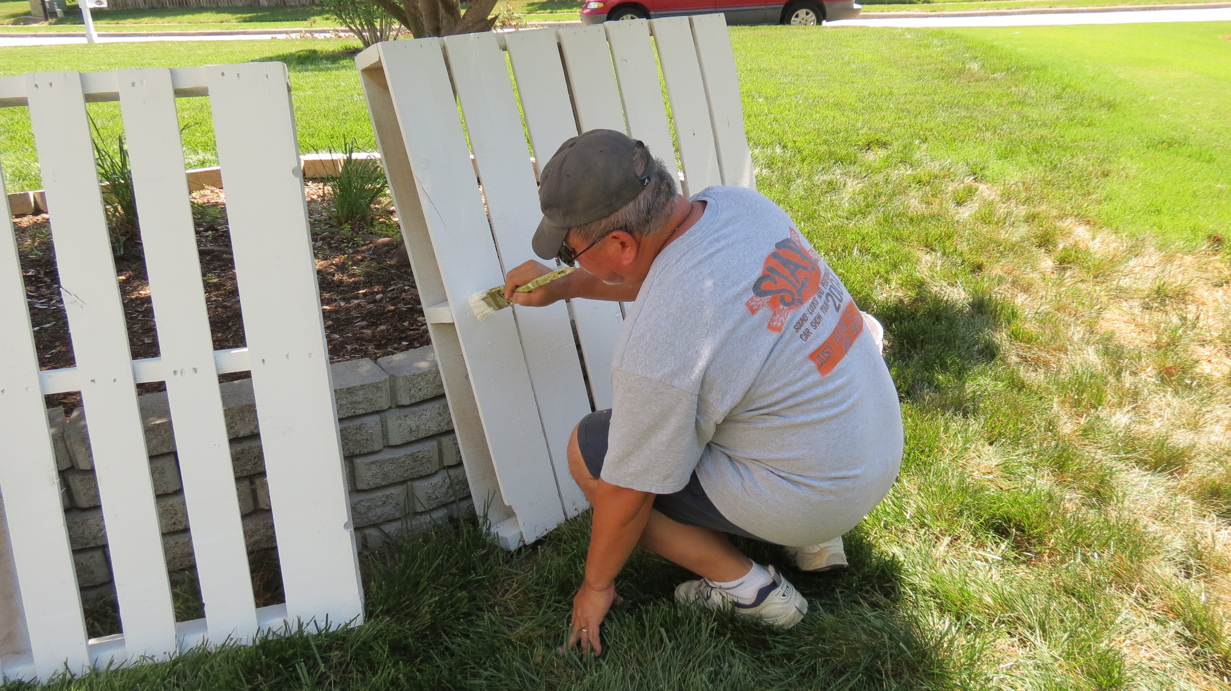 After we measured and screwed in all the boards to the posts, we painted the horizontal boards and touched up the pallets. It looked like we beat them up as we were moving and trying out each pallet.